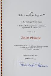 Die Zelter-Plakette wurde 1956 von Bundespräsident Theodor Heuss gestiftet, und zwar „als Auszeichnung für Chorvereinigungen, die sich in langjährigem Wirken besondere Verdienste um die Pflege der Chormusik und des deutschen Volksliedes und damit um die Förderung des kulturellen Lebens erworben haben“.