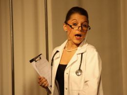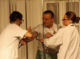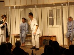 Fernab der Öffentlichkeit hatte die resolute, bestimmende Ärztin, von Simone Müller eindrucksvoll verkörpert, nur ein Ziel: ihr neues Medikament an Menschen zu testen weil es mit den Mäusen nicht geklappt hatte (keine Ähnlichkeit mit der Schweinegrippe natürlich…). Blind vor Energie und dennoch pochend auf ihr Arztgeheimnis verfolgte sie energisch ihr Ziel, ihr neues Medikament zu testen.