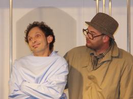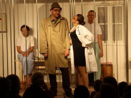 Regelmäßig wurde sie aber gestört durch den Besuch des Kommissars, von Sebastian Schmidt gekonnt naiv dargestellt, der das „größte Vertrauen“ in die Fähigkeiten und Führungsstil der Ärztin hatte. Sein erster „Irrer“ den er mitbrachte war Jacky, gespielt von Axel Albiez, der in Zwangsjacke, mit weit aufgerissenen Augen und einem breitem Grinsen im Gesicht vor sich hin stotterte. Das Publikum klatschte tosenden Beifall um diese Mimik und Gestik…