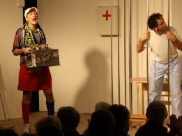 Plötzlich, wie aus dem nichts, erschien die Limo-Verkäuferin, eine Rolle die Patricia Kramer mit vollem Einsatz gekonnt spielte (sie war erst vor wenigen Tage eingesprungen für eine erkrankte Mitspielerin). Sie hatte sich „durch die Kanalisation vom Fußballstadion hierher verlaufen“ und wollte „Cola-Limo-Biehier“ verkaufen.
