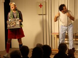 Der nächste „Patient“ war Charles, sooo herzig dargestellt von Markus Flum. Er sah aus wie ein ausgewachsener Gartenzwerg mit grauem Ringbart in Zwangsjacke, oder war es sein philosophisches Aussehen was dem Publikum zu Lachsalven veranlasste. Er ließ sich reimend in seine Zelle einsperren mit so „dummen“ Sprüchen wie „Ich denke, also bin ich“…