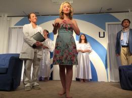 An die Schauspieler stellte das Stück sehr hohe Ansprüche, die sie ausnahmslos hervorragend bewältigten. Ein großer Applaus war der Lohn für eine in allen Teilen gelungene und sehenswerte Aufführung. Monika Kreso als Dr. S. spielte eine eher kühl wirkende Person mit einem großen Herz. Sie geleitete die Personen zum Aufzug, der die Toten nach oben und die Lebenden nach unten fährt, nicht wissend wo er hält. Ihr zur Seite standen Simone Müller und Axel Albiez. Beide konnten nicht sprechen, wurden aber von den Hotel Insassen gehört und zwar von jedem auf andere Weise, was zu Verwirrungen führte. Sie strahlten ohne Worte große Autorität aus.