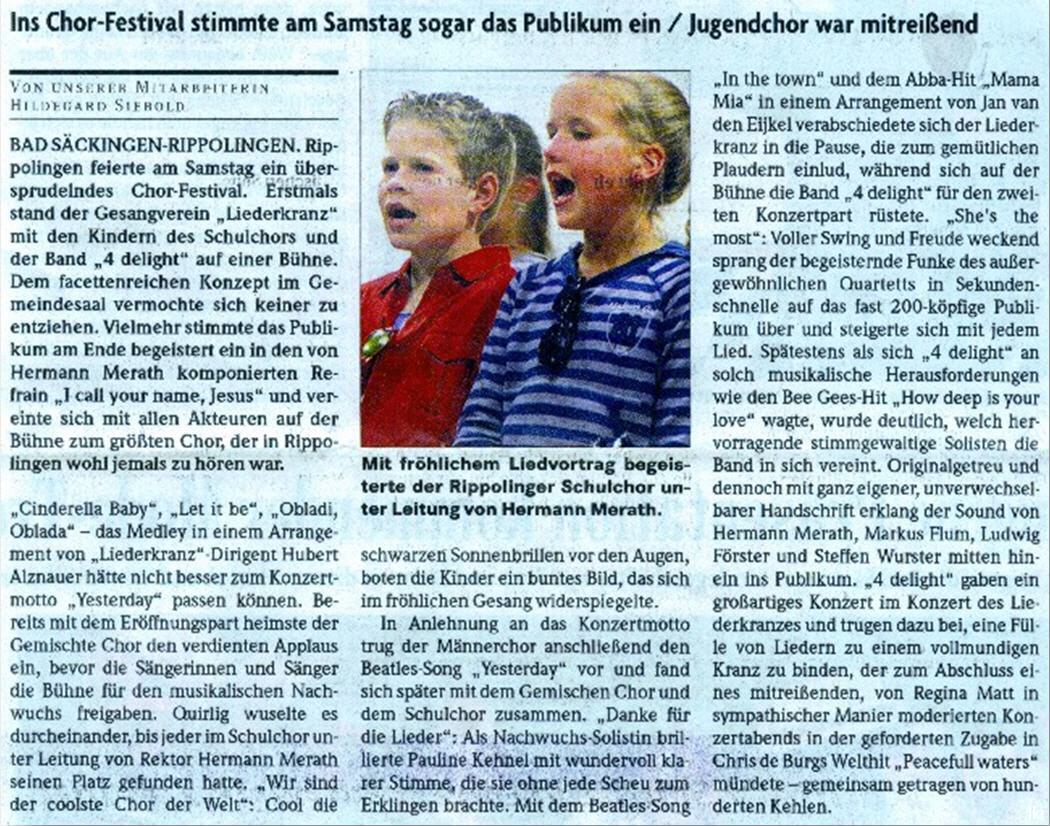 In Anlehnung an das Konzertmotto trug der Männerchor anschließend den Beatles-Song "Yesterday" vor und fand sich später mit dem Gemischten Chor und dem Schulchor zusammen. "Danke für die Lieder": Als Nachwuchs-Solistin brillierte Pauline Kehnel mit wundervoll klarer Stimme, die sie ohne jede Scheu zum Erklingen brachte. Mit dem Beatles-Song "In the town" und dem Abba-Hit "Mama Mia" in einem Arrangement von Jan van den Eijkel verabschiedete sich der Liederkranz in die Pause, die zum gemütlichen Plaudern einlud, während sich auf der Bühne die Band "4 delight" für den zweiten Konzertpart rüstete. "She's the most": Voller Swing und Freude weckend sprang der begeisternde Funke des außergewöhnlichen Quartetts in Sekundenschnelle auf das fast 200-köpfige Publikum über und steigerte sich mit jedem Lied. Spätestens als sich "4 delight" an solch musikalische Herausforderungen wie den Bee Gees-Hit "How deep is your love" wagte, wurde deutlich, welch hervorragende stimmgewaltige Solisten die Band in sich vereint. Originalgetreu und dennoch mit ganz eigener, unverwechselbarer Handschrift erklang der Sound von Hermann Merath, Markus Flum, Ludwig Förster und Steffen Wurster mitten hinein ins gefesselte Publikum.