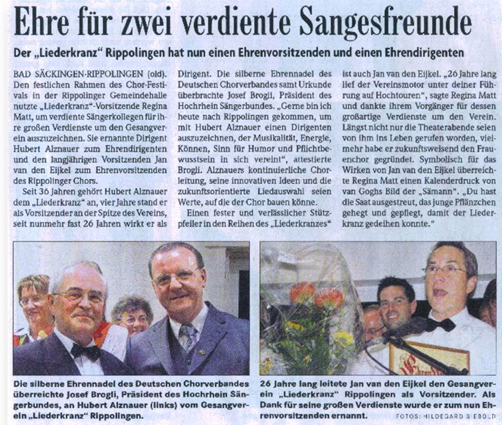 Seit 36 Jahren gehört Hubert Alznauer dem Liederkranz an, vier Jahre leitete er den Chor als Vorsitzender, seit nunmehr fast 26 Jahren wirkt er als Dirigent. Die silberne Ehrennadel des Deutschen Chorverbandes samt Urkunde überbrachte Josef Brogle, Präsident des Hochrhein Sängerbundes, höchst selbst. "Gerne bin ich heute nach Rippolingen gekommen, um mit Hubert Alznauer einen Dirigenten auszuzeichnen, der Musikalität, Energie, Können, Sinn für Humor und Pflichtbewusstsein in sich vereint", attestierte Brogle dem Geehrten. Seine kontinuierliche Chorleitung, seine Ideen und die zukunftsorientierte Liedauswahl seien echte Werte, auf die der Chor bauen könne.