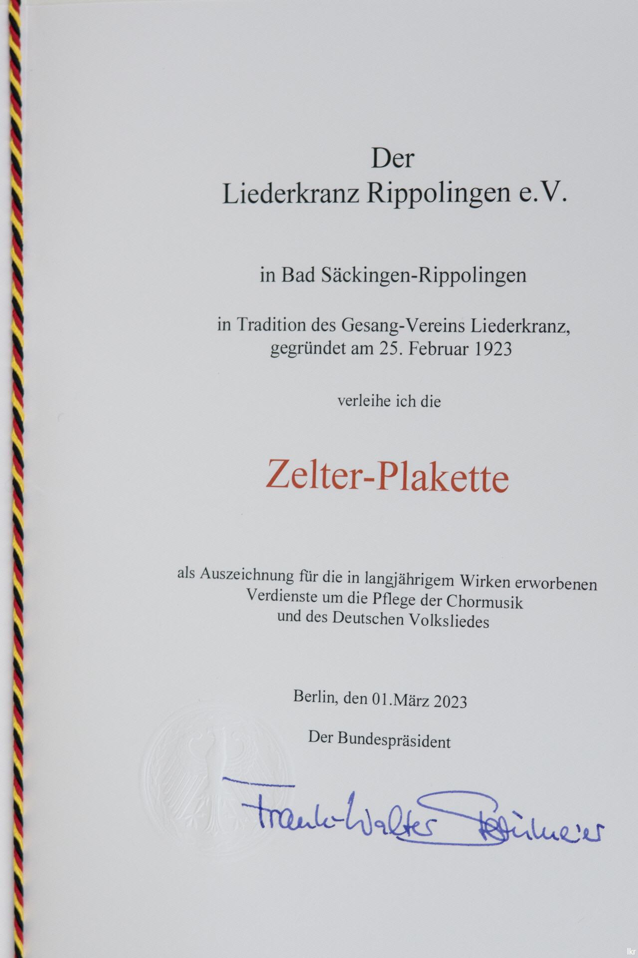 Die Zelter-Plakette wird auf Antrag des Chores zusammen mit einer Urkunde durch den Bundespräsidenten verliehen.