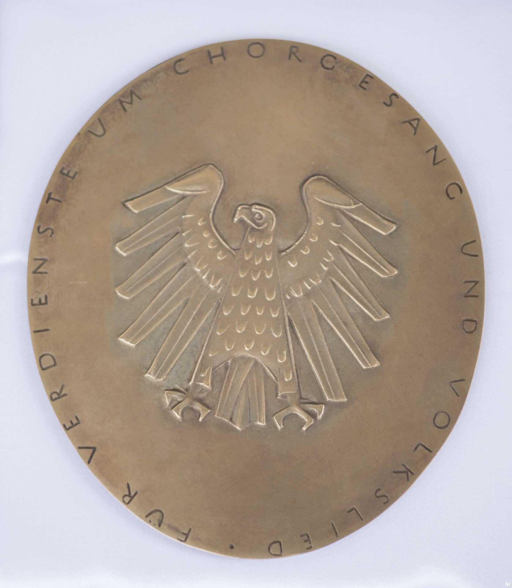 Die auffällig ovale Plakette aus Bronze, sie ist 13,5 x 15,5 cm groß, 450 g schwer und zeigt auf der Vorderseite das Porträt Carl Friedrich Zelters (1758-1832). Auf der Rückseite befindet sich der Bundesadler mit der Umschrift „Für Verdienste um Chorgesang und Volkslied“