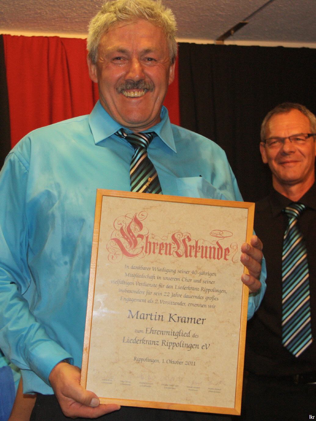 wurde Martin Kramer vom Vizepräsidenten des Chorverband-Hochrhein, Josef Vogt, mit einer Urkunde und goldener Nadel für 40 Jahre aktive Mitgliedschaft ausgezeichnet. Auch Gina lobte den unermüdlichen und engagierten Einsatz Martins. Er war nicht nur 22 Jahre stv. Vorsitzender sondern engagierte sich auch in vielen weiteren Ämtern unseres Chores, weshalb Sie ihn zum verdienten Ehrenmitglied ernannte.