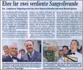 13. Oktober 2007 Den festlichen Rahmen unseres Konzerts nutzte unsere Vorsitzende, Regina Matt, um verdiente Sängerkollegen für ihre großen Verdienste um den Verein auszuzeichnen. Gleichsam ernannte sie Dirigent Hubert Alznauer zum Ehrendirigenten und den langjährigen Vorsitzenden Jan van den Eijkel zum Ehrenvorsitzenden des Chors. Seit 36 Jahren gehört Hubert Alznauer dem Liederkranz an, vier Jahre leitete er den Chor als Vorsitzender, seit nunmehr fast 26 Jahren wirkt er als Dirigent. Die silberne Ehrennadel des Deutschen Chorverbandes samt Urkunde überbrachte Josef Brogle, Präsident des Hochrhein Sängerbundes, höchst selbst. "Gerne bin ich heute nach Rippolingen gekommen, um mit Hubert Alznauer einen Dirigenten auszuzeichnen, der Musikalität, Energie, Können, Sinn für Humor und Pflichtbewusstsein in sich vereint", attestierte Brogle dem Geehrten. Seine kontinuierliche Chorleitung, seine Ideen und die zukunftsorientierte Liedauswahl seien echte Werte, auf die der Chor bauen könne. Symbolisch für das Wirken von Hubert Alznauer überreichte Regina Matt einen Kalenderdruck von Van Goghs Bild der "Sämann". "Du hast die Saat ausgestreut, das junge Pflänzchen gehegt und gepflegt, damit der Liederkranz gedeihen konnte."