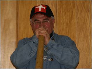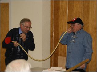 Er stellte ein besonderes Instrument vor: das Alphorn. Er streifte dabei nicht nur Theoretisches wie Herkunft und Entwicklung sondern ließ auch Töne erklingen und zwar aus dem Mundstück (Hochton), aus dem Gartenschlauch mit und ohne Trichtervorsatz (Mittelton) und spielte zum Schluss noch die Melodie Amazing Grace.