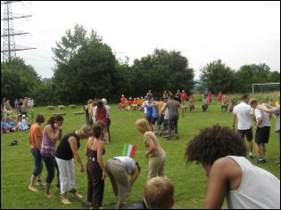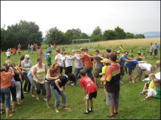 Die Verbundenheit mit der Grundschule brachte auch der Liederkranz zum Ausdruck. Wir organisierten ein Spiel für die Eltern: mit zusammengebundenen linken Beinen mussten die Männer (Väter) gegen die Frauen (Mütter) einen Parcour mit Hindernissen zurücklegen, was für viel Freude bei den Kindern und Zuschauern sorgte. Nicht Geschwindigkeit sondern Geschicklichkeit war gefragt. Es gewannen die Väter knapp vor den Müttern.