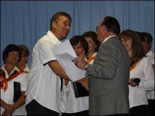 Der Präsident des Hochrheinsängerbundes, Josef Brogle übergibt die Patenschaft-Urkunde an Rektor Hermann Mehrat |