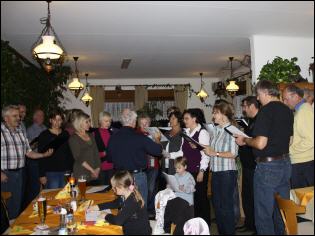 Am Nachmittag des 17. Dezember 2009 trafen sich die Senioren aus Rippolingen im Gemeindesaal um zusammen Weihnachten zu feiern. Im festlich geschmückten Saal roch es nach duftenden Kerzen und Kaffee. Wir Sängerinnen und Sänger waren Berufs- und Schulfestbedingt zwar nur wenige aber wir kamen gerne um an diesem Fest einige Weihnachtslieder vorzutragen. Unsere Vorsitzende Regina lud die Senioren ein, die letzte Strophe von Stille Nacht, Heilige Nacht mitzusingen. Die zweite Strophe sangen wir piano und als wir die dritte Strophe gemeinsam anstimmten, quoll der Gesang Raum füllend in den Gemeindesaal, die Senior(inn)en sangen aus voller Brust mit. Und so schwang es noch nach, als wir viel später den Saal wieder verließen. Einen schönen Abschluss in diesem Vereinsjahr…