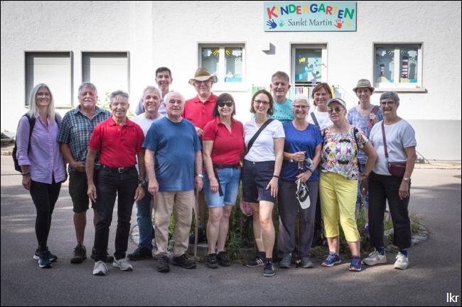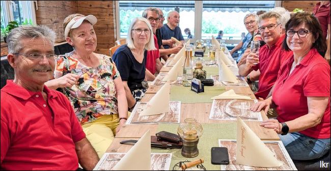 16 Wanderer trafen sich vor dem Rathaus, um bei hochsommerlichem Wetter die ca. sieben Kilometer lange Wegstrecke zum Gasthaus Engel in Niederhof anzugehen. Die Strecke führte vorbei am Sportplatz nach Harpolingen, weiter zur Lochmühle ins Murgtal und von dort auf einem sehr idyllischen Pfad nach Zechenwiehl, um dann vorbei am Reitstall zum Ziel zu gelangen. Nach ca. anderthalb Stunden war es geschafft, im Gasthaus Engel warteten bereits sieben weitere mit dem Auto angekommenen Liederkränzler auf die verschwitzen Wanderer. Die Durstlöscher und die vorbestellten Essen wurden innerhalb kürzester Zeit serviert. Nach dem sehr gemütlichen Beisammensein in schöner und angenehmer Atmosphäre fuhren die meisten mit dem Auto nach Hause, doch vier Unermüdliche machten sich bei Vollmondschein wieder zu Fuß auf den Heimweg.
