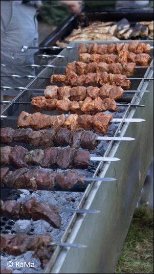 Keinen Vorbereitungsaufwand scheuten unsere Vereinsköche Beppo und Andreas, denn sie "spießten" Schwein, Rind, Schaf, Geflügel, Crevetten, Datteln auf, um diese dann meisterlich zu grillen. Als Entree wurde gegrillter Lachs angeboten, dazu von den Mitgliedern in verschiedenen Farbvarianten zubereitete Salate, außerdem gab es auch noch leckeres Backofengemüse. Es schmeckte alles fantastisch.