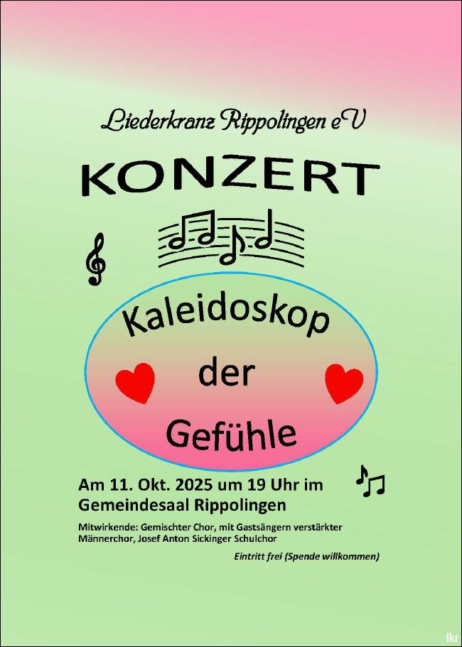 Kaleidoskop der Gefühle ist das Motto des feierlichen Jahreskonzertes des Liederkranz Rippolingen e.V.. Es findet am Samstag dem 11. Oktober 2025 ab 19 Uhr im Gemeindesaal statt. Seit über einem Jahr proben die Sängerinnen und Sänger intensiv für den Höhepunkt des laufenden Vereinsjahres. Freuen Sie sich auf ein abwechslungs- und facettenreiches Liedprogramm, aufgeführt von unserem gemischten Chor, dem mit Gastsängern verstärkten Männerchor, Instrumentalisten, sowie dem Josef Anton Sickinger Schulchor. Der Liederkranz freut sich sehr auf Ihren Besuch!