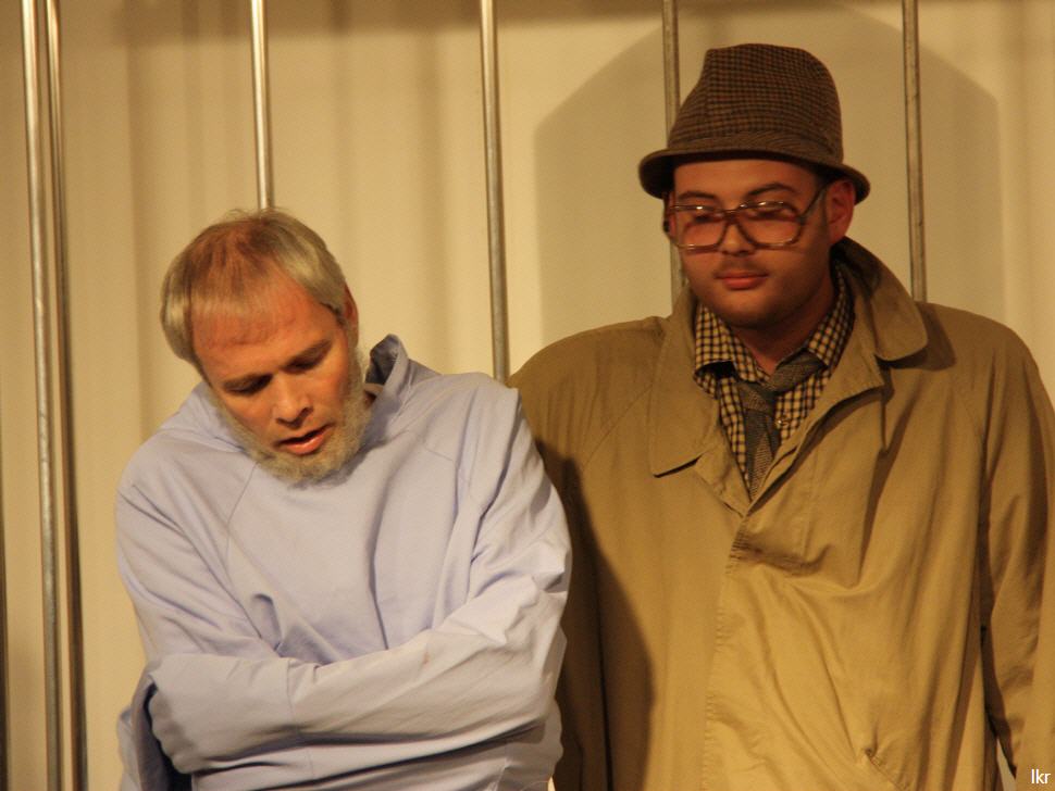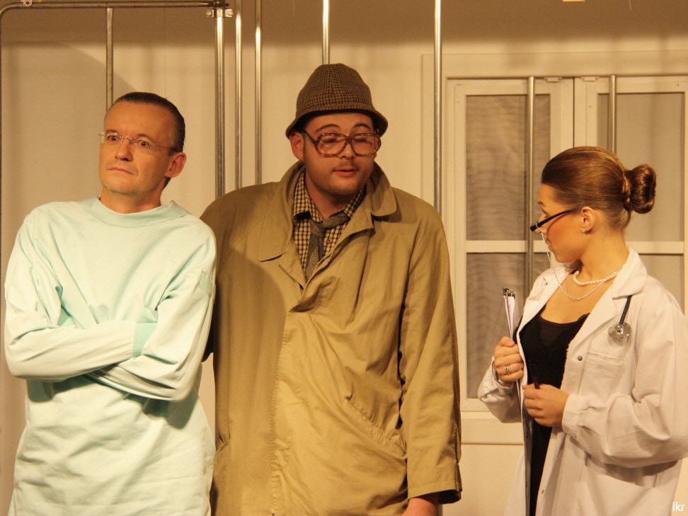 Regelmäßig wurde sie aber gestört durch den Besuch des Kommissars, von Sebastian Schmidt gekonnt naiv dargestellt, der das „größte Vertrauen“ in die Fähigkeiten und Führungsstil der Ärztin hatte. Sein erster „Irrer“ den er mitbrachte war Jacky, gespielt von Axel Albiez, der in Zwangsjacke, mit weit aufgerissenen Augen und einem breitem Grinsen im Gesicht vor sich hin stotterte. Das Publikum klatschte tosenden Beifall um diese Mimik und Gestik…