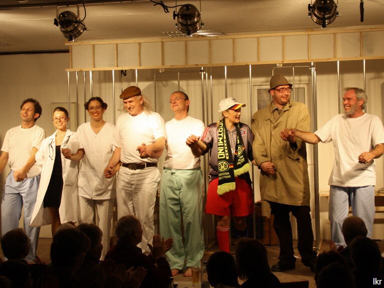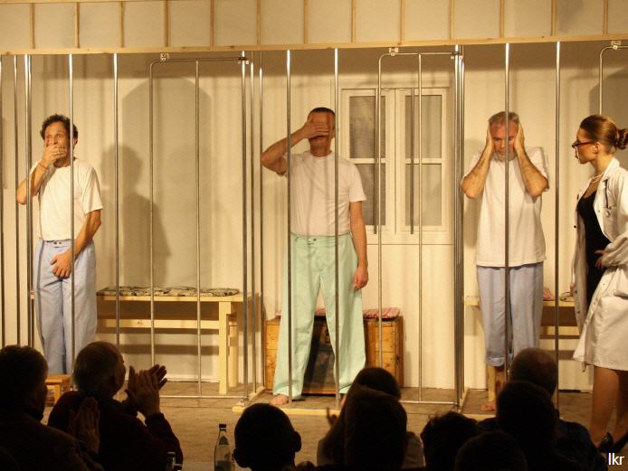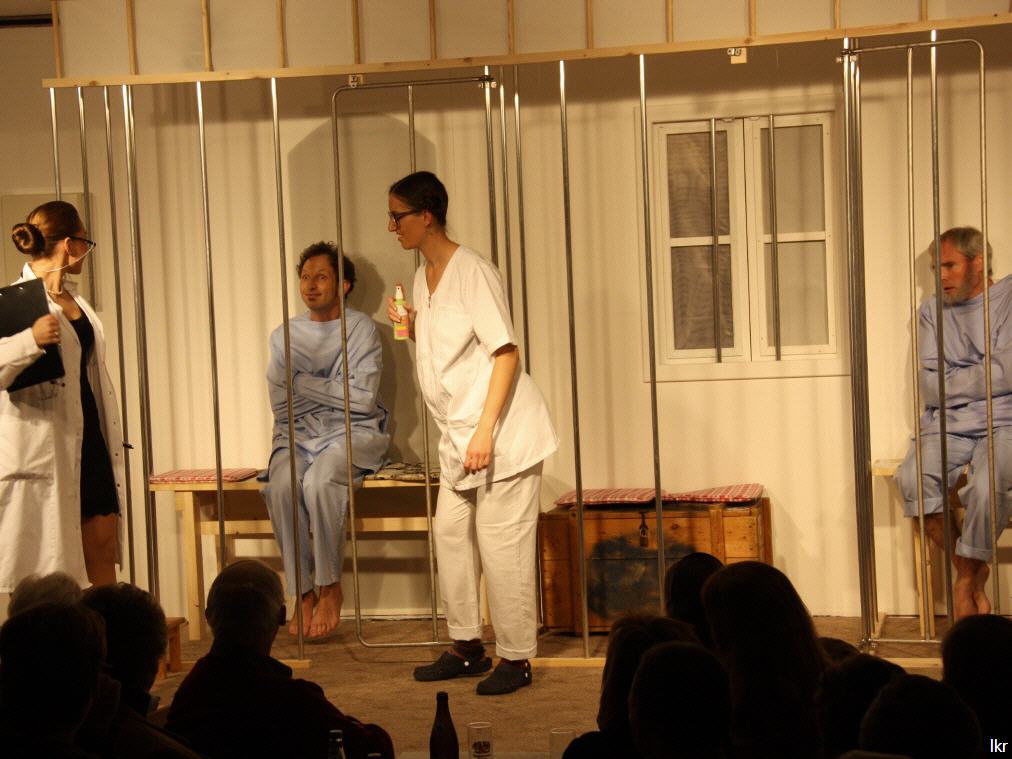 Der nächste „Patient“ war Charles, sooo herzig dargestellt von Markus Flum. Er sah aus wie ein ausgewachsener Gartenzwerg mit grauem Ringbart in Zwangsjacke, oder war es sein philosophisches Aussehen was dem Publikum zu Lachsalven veranlasste. Er ließ sich reimend in seine Zelle einsperren mit so „dummen“ Sprüchen wie „Ich denke, also bin ich“…