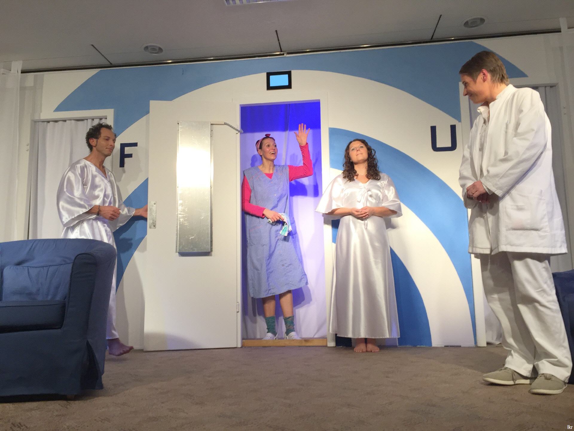 An die Schauspieler stellte das Stück sehr hohe Ansprüche, die sie ausnahmslos hervorragend bewältigten. Ein großer Applaus war der Lohn für eine in allen Teilen gelungene und sehenswerte Aufführung. Monika Kreso als Dr. S. spielte eine eher kühl wirkende Person mit einem großen Herz. Sie geleitete die Personen zum Aufzug, der die Toten nach oben und die Lebenden nach unten fährt, nicht wissend wo er hält. Ihr zur Seite standen Simone Müller und Axel Albiez. Beide konnten nicht sprechen, wurden aber von den Hotel Insassen gehört und zwar von jedem auf andere Weise, was zu Verwirrungen führte. Sie strahlten ohne Worte große Autorität aus.