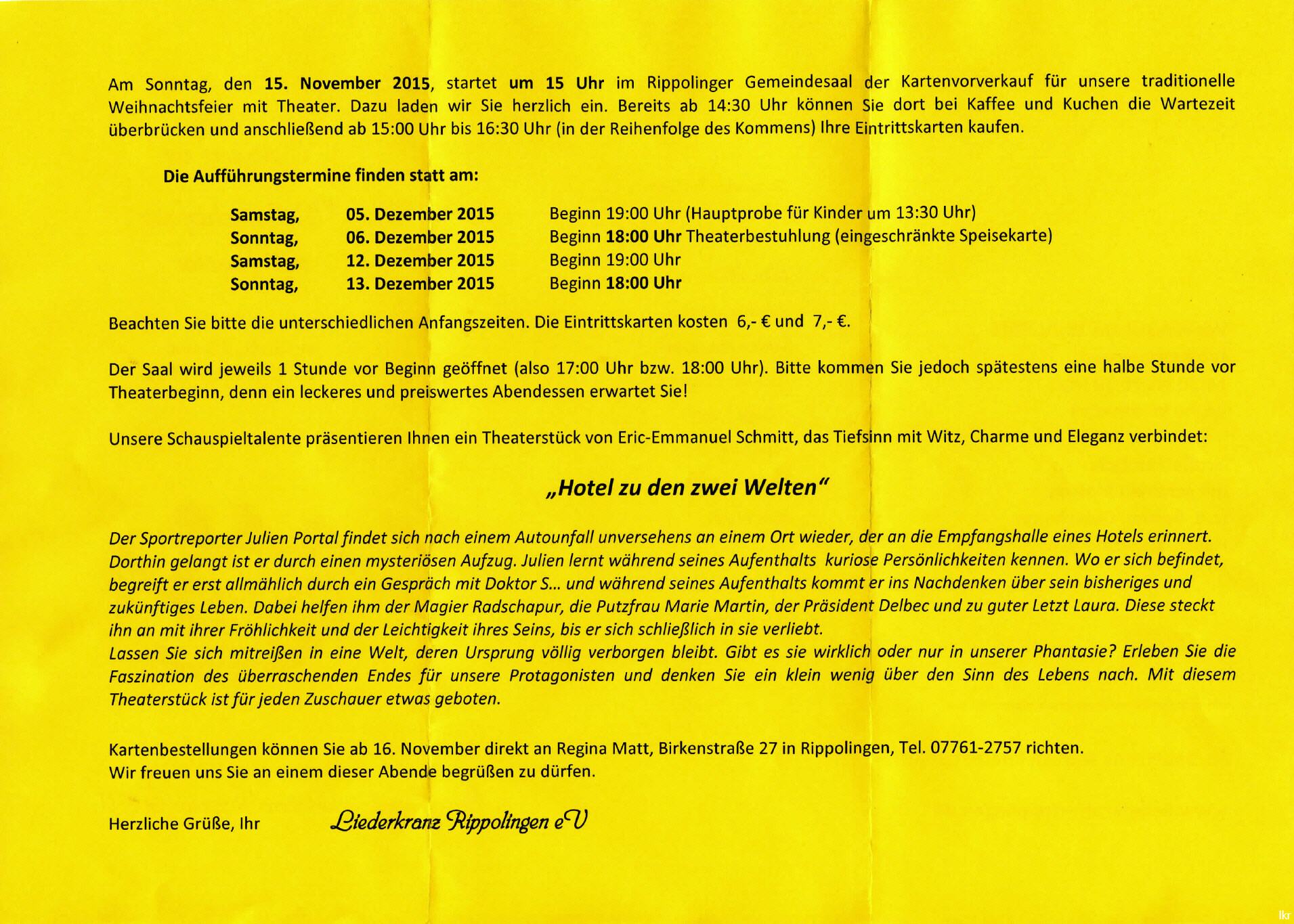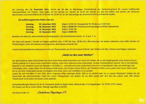 Im restlos ausverkauften Gemeindesaal begrüßte der Gesangverein Liederkranz bei der Weihnachtsfeier mit stimmungsvollen Liedern die Gäste. Was erwartet uns Menschen nach dem Sterben? Mit dieser existentiellen Frage setzten sich die Laienschauspieler des Gesangvereins bei der anschließenden Theateraufführung auf höchst vergnügliche und witzige Art auseinander, ohne dabei die Ernsthaftigkeit außer Acht zu lassen.